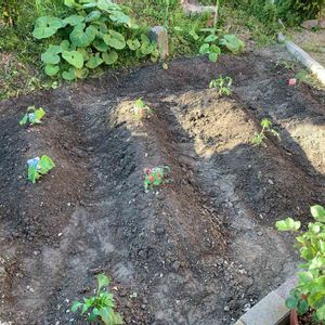 3週間前からポット栽培状態だったミニトマトたちを植えました🍅🥒 ミニトマトアイコ ミニトマトCF千果 ミディトマトフルティカ ホーム桃太郎EX 各1株づつ きゅうり黄金女神2号 3株 私の足で少し大股6歩の奥行 幅は3歩❣ わが家のハウス、小さいけど野菜栽培頑張ります✊Fight❗ picの奥に耕うん機あるでしょ😆(この為に買った💦) 主人に起こしてもらったよ😁 もう片側に茄子やピーマン、シシトウ、スナップエンドウ…入るかな🤭