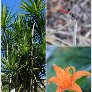 週末散歩🚶♀️で 見つけたトンボ、花、植物 それぞれ美しいσ(♡∞♡)💕 ⬅️青空映えのドラセナ ↗️枝先に止まった赤とんぼ ↘️鮮やかオレンジ色の ワスレグサ(カンゾウ)🧡