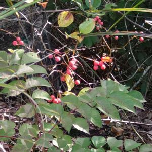 こんにちは〜😊 いつもの散歩道🚶♀️🚶♀️🚶♀️ トゲがあるようなのでサルトリイバラですね~ 赤い実がなっていました🔴🔴🔴 2025.10.27 📷️