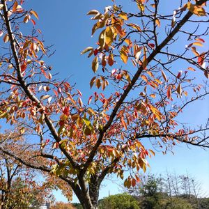 おはようございます😊 いつもありがとうございます♡ いつもの散歩道🚶♀️🚶♀️🚶♀️ 青空に桜の紅葉が映えていました🍂🍁 2025.10.17 📷️