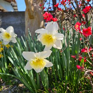 おはようございます(^^) 今日も晴れ☀️ 木瓜の花と水仙がとても良い感じです♥️🤍💛 今日も穏やかな一日であります様に🙏💗