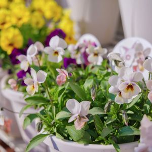 ①②ビオラ サクラドロップス ピンク系の丸い花弁のかわいいお花です 色幅はアプリコットピンクから淡いピンク 春先にはブーケのようになる予感がします♡♡ ③ビオラ ディージェイ 春の色合いにときめいてしまいます♡♡ ④パンジー カーリーウィッチ うさこちゃんあらわる!♡♡