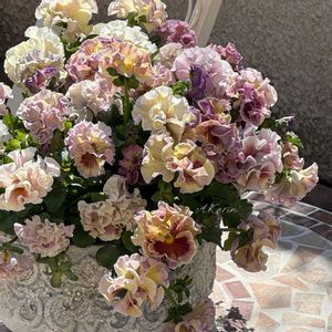 寄せ植え𖤣𖥧𖥣。 パンジー *⋆⸜ アンティークラッフル ⸝⋆* 花首が長めで小さな花瓶に挿しやすい˶'ᵕ'˶ "ラッフル" 波立つという意味で、ブラウスやスカートにあるあれです。ラッフルはひだの幅がフリルより広いんですよね𓂃𓄹𓄺 ワッフル。シャッフル。と間違えて言ってしまいそう ՞ ܸ. .ܸ՞ 関係ないけど、スナッフルは、鼻詰まりのこと!😮💨来春は杉花粉到来が早く、しかも過去最大量という☀︎*。😷ヤダナ ☀︎*。もう飛んでる気がする🤧.。oஇ 最高に可愛らしいお花の話から鼻の話になってしまった* .ˬ.)