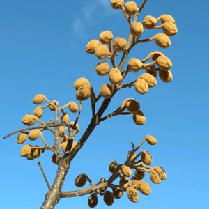 桐(キリ) キリ科キリ属の落葉高木。中国南部原産で、中国では古来より琴の材料として用いられることから、中国文化とともに渡来したのではないかといわれる。材は国産材の中で最も軽く、湿気を通さず狂いがないことから家具材などに使われ一般には栽培もされるが、野生化もしている。葉は五角形状で径20~30㎝前後になり日本最大級。花期は5~6月、枝の先に円錐形の大形の花序をつけ、淡紫色の花が下向きに開く。10月頃に果実が茶褐色に熟し、木質化して尖った卵形となる。その後先端が2裂して中から数千個といわれる極小の種子が飛ばされる。種子には縁にフリルのような翼が二重、三重に重なりあい美しい。種子を飛ばし終えて枯れた果実は枝に残る。冬の花芽は丸く、毛に覆われ花序にたくさんついて目立ち、一目で桐とわかる。 昔は、女の子が生まれたら桐を植えて嫁入りのときに箪笥をつくる慣習があった。桐は成長が早く、20年前後で利用可能な大きさになる。桐の道管は他の樹木と比べて太く、乾燥させると空洞となってより多くの空気を含む。この蓄えられた空気によって、湿度の変化に敏感に反応し温度の変化を内部に伝えないようにする。湿気の多い日本では、この性質を利用して箪笥を作る。湿度が高いときは湿気を吸収して材が膨らみ隙間が閉まり湿気を通さない。逆に空気が乾燥すると隙間が開いて空気をとおすようになる。また、内部に熱を伝えにくいため燃えにくい。洪水にあっても浮いて流れ、中身を守ってくれる。安政の大地震の後ではその効果が確かめられたので、桐箪笥がよく売れた。 中国では鳳凰の止まる聖木とされる。日本でもこの思想から菊花とならんで皇室の紋章で、菊は正紋、桐は副紋とされる。日本政府も五七桐とよばれる紋章を用いている。 名前の由来は、切ってもすぐ成長するためとも、よく成長させるために一度切るために『切る』がキリになったともいわれる。 出典『都会の木の花図鑑』『樹木の名前』『知っておきたい100の木』