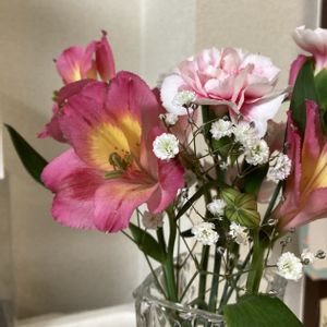 おうちシリーズ🏠 アルストロメリアさんとカーネーションさんのミニ花束💐、月命日のお供えです🙏😊 オレンジのハイビスカスさんも、また咲きました🌺🌺 ③のプチオレンジさんは、本来の大きさ(5㎝ぐらい)あります😊🍊 ④のサマーブリーズさんは、6㎝ぐらいしかないです(本来は10㎝ぐらいです😅)が、この小ささが余計に可愛いです😊🧡