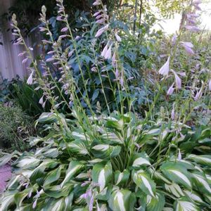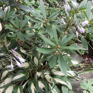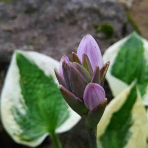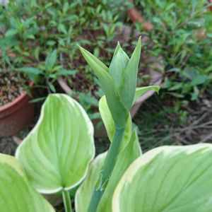 今日のお花 「ギボウシ」 済州島斑入り 2年前旅のおみやげで頂きました。 何とか生きながらえていますが増えません😖 初めてお花が付きました。(まだ蕾です) 嬉しいです😊