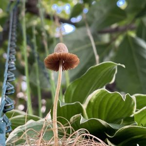 👒ギボウシの吊り下げプランターに出たきのこ この間ののっぽさんのきのこより裾が広がって まぁ♪😍 下から撮って見ました 🍄こんなの見つけると思わずにっこりしてしまいますね😀 🤎♪なんて可愛いらしいのだろう♪🥰