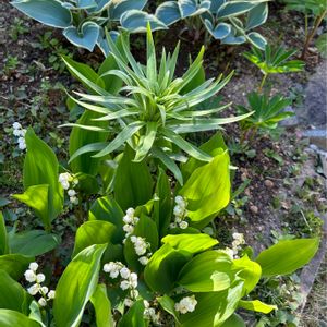 今日の庭pic。ギボウシとスズランの間の中には,近くの枝垂れ紅葉隣りのユリのこぼれだねからの幹が伸びてます。