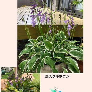 庭で1番賑やかに咲いてるギボウシの花! 毎年のこぼれ種から増えたもの! 数年の内に群生してくれました! 葉が焼けて少し見栄えが良く無いけれど、花はいっぱい綺麗です☺️ 葉が5.6枚の3年目のが可愛く、花茎1本を立ててあちこちに咲いてます。 植木鉢の斑入りギボウシは焼けた葉を取り除き、ボリュームダウンしてますが曲がってた花茎も伸びて、花は賑やかに良く咲いてくれてます☺️