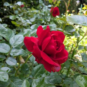 お早う御座います〜☀ 雨上がりの庭では深紅の🌹が鮮やかに青空に映え次々と咲いている!! 鉢植え🩷薔薇も負けじと〜 そして50年目の白薔薇も孫木が…頑張り屋さんだね💪 もうスグ開花だね〜👏🥰🎶 楽しみな日々です🙋💞