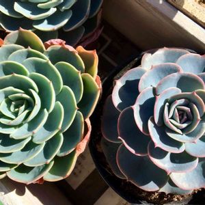 七福神、すでにいくつもあるんですが違うタイプの七福神がずっとお店にあってついついお迎え。 インブリカータ(七福神)のタグが付いていました。 上の楕円の鉢の左側がそうで、ほんのりピンクなのが可愛い😆 青っぽいのは狩った時は徒長して葉の枚数も少なかったけど少しずつ中心部の密度が出てきています🎵