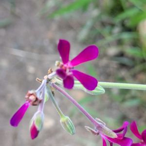 ワインカラーのちいちゃいお花 ペラルゴニウム シドイデス 蕊がくるりんぱ 可愛らしい〜(❁1センチ程) 西駐車場側 地植え