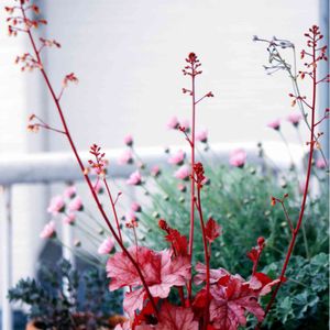 雨の朝☔️ 軒下のお花たち🌸 ちょっとした記念撮影です📷✨ ヒューケラ カラスバミセバヤ ローダンセマム 右に少し見えるのは、ペラルゴニウムシドイデス