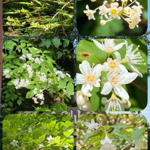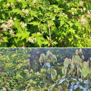 山の中の日差しがあまり当たらないとこの「コゴメウツギ」の花付きはあまりよくなかったですけど、山の上の方でお日さまをいっぱいに浴びた木の花はもう満開です😍 ⬇️はちょっと逆光で色飛びしてしまったけど、「シロダモ」の若葉(もうだいぶ白さが無くなってきました)ともたれ合うようにして満開に開いている「コゴメウツギ」