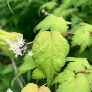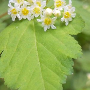 5月14日撮影 赤塚植物園 コゴメウツギの花です。 花弁は5枚、萼片が5枚。でもどちらも真っ白なので、花弁は10枚あるように見えます。 細長いものが花弁で、短く丸い方が萼片です。雄しべは10個、雌しべは1個。 花は咲き始めは中が黄色く、雄しべの葯も黄色です。 だんだん雄しべが内側を向いてきて、葯の色も変わってきます。花の内側も白くなってきました。 やがて細長い花弁が落ちて萼が5つ残り、5弁の花のようになってきます。 そのあと子房が膨らんでくるようですが、わたしには見つけられませんでした。 これから膨らんでくるんでしょう。 (参考資料:ブログ「高尾山とその周辺を歩いて」) コゴメウツギ(小米空木) バラ科スグリウツギ属 ウツギの名が付いているが、バラ科。コゴメウツギ属(Stephanandra)からスグリウツギ属(Neillia)に変更された。 太平洋側に多い。幹は灰褐色。葉は互生し、長さ2~4㎝の三角状広卵形、重鋸歯縁、葉先は尾状に尖り、基部は切形~心形、葉裏の脈上に軟毛がある。葉柄は長さ3~7㎝、軟毛がある。托葉は長さ約5㎜の披針形。円錐花序~散房状の花序に小さな花を多数つける。花は直径4~5㎜の白色の5弁、萼片が大きく、10弁花に見える。萼片は卵円形、縁に細鋸歯と毛があり、果実を包んで残る。雄しべは10個、花弁より短い。果実は直径2~3㎜のほぼ球形の袋果、有毛、種子が2個入る。種子は直径約1.5㎜、広倒卵形。 (三河の植物観察 より)