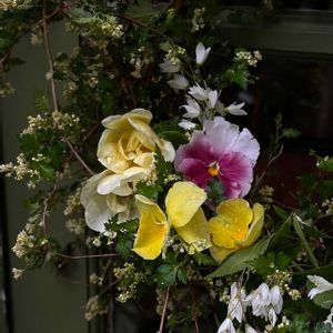 しなやかな細い枝に小さな白い花を咲かせるLaceshrub コゴメウツギが生茂るので間引いた物をリースにしました パンジーと薔薇、初夏の訪れを知らせるヒメウツギを添えて