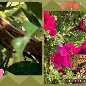 虫嫌いな方すいません。゚( ゚இωஇ゚)゚。 トノサマバッタとアゲハ蝶 ひだまりの中で陽だまりの中で陽だまりの中で気持ち良さそう😃 ここは花屋さんの店先です◝(⑅•ᴗ•⑅)◜ 赤いペチュニアにアゲハ蝶 たしか先月もあったなぁ❣️
