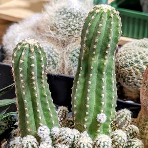 トリコケレウス 白檀 今年2回目の投稿です、 あと数日で2月なんですね。 早いですねェ〜 引き続き外装工事の為、室内管理の多肉達です。 流石にここまで来ると徒長しはじめています。 特にエケベリア 葉先が赤くなるはずが全く色も変わらず。ダラ〜っと気合が抜けている感じになっています😓 塊根植物とサボテン達はマイペース でもサボテンは今年花付きがわるいかもしれない😢残念です こちらのビャクダンは冬になると恐ろしく紫色になるのに今年は、色も変わらず子沢山で楽しく暖を取ってるみたいでほのぼのします。が……… 2022年購入した時の写真みたら だいぶスリムになっていました これだけ子を吹けばしょうがないのかなぁ〜 ビャクダンと言えばエキノケレウス紐サボテン これ、紐になる感じがしないなァ〜 ビャクダン❤面白いサボです