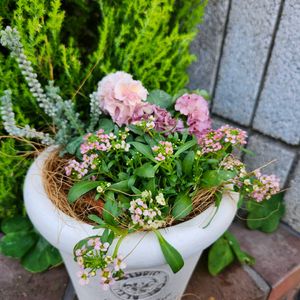 アントワネット姫の小さな寄せ植え🩷 ホントは🧺に3苗植える予定だったけど ぎゅうぎゅうになっちゃったので この子は単品にして アリッサムやカルーナを ちょこっと添えてみました🤗 最近全然予定通りにいかない 無計画kumaluluです…😅