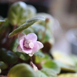 斑入り葉のミニセントポーリア。淡いピンク色と渋い色の葉が桜餅を連想させます。 この子は今年の1月下旬から咲き続けています。中心部の葉の斑がとてもきれいです。