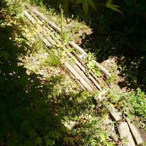 草むしり後 ハゲチャビン。 前に使っていた、花壇の境に使っていた木を奥まで行けるように敷きました。
