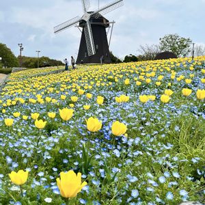 こんにちは✨ 今日🎵大阪の花博記念公園鶴見緑地に行ってきました😊 風車の丘大花壇のチューリップとネモフィラが、見頃で💕とても綺麗でした😄 桜も満開で綺麗でした✨