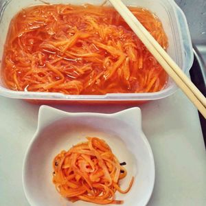 【酢人参】 昨日、収穫した人参🥕で酢人参🥕を作りました。 レシピ ① 人参🥕2本程、細切りスライサーで細く切る ② 容器に入れて酢を したしたに入れる ③ その中に塩をこさじ半分を入れる ④ ハチミツ🍯を大さじ2杯入れる ⑤ 冷蔵庫に30分程 寝かせて完成 もっと甘味が欲しい方は🍯ハチミツの追加をして下さい 【食前に食べる効果】 ① 血圧を下げる ② 血糖値の上昇を抑える ③ 腸内環境の改善 ④ 老化防止 ⑤ ダイエット TikTokに動画配信しています。