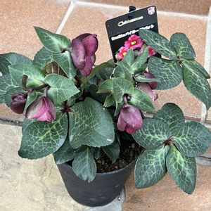 出掛けたついでにいつも行く園芸店に立ち寄った時に出会ってしまいました🥰 Frostkiss バイビーベルベット 斑入りの葉のダークカラーのシングルのクリスマスローズです🥀 氷の薔薇をお迎えしようかなーって見ていたらポツンとひとつだけ模様入りの葉っぱが🎵 氷の薔薇は欲しかった色がなくてカラーリーフとかなり悩んで最後の1個だったこの子をお迎えしました😊 このシリーズは花付きが良くて丈夫で成長が早く、また切花向きで2週間もキレイを保つらしいのでこれもまた嬉しい💕 まだ咲き始めなのでこれから花開くのが楽しみです🎵