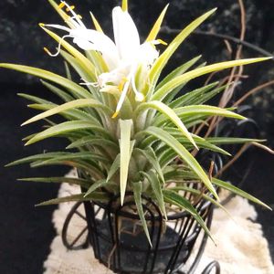 お出かけついでに 立ち寄ったスーパーで 見つけちゃいました 真っ白な花が咲いてる チランジアさん 198円👛 パイナップルみたいで 気に入りました😍🍍 イオナンタ とはラテン語でスミレ色という意味らしい 赤やピンクの花をつけてるチランジアなら見たことがありましたが 白も い〜ょお なんてネ🤭