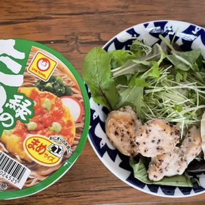 こんにちは😃 今日のお昼 まめたぬきとサラダ🥗 今日ブロッコリースプラウトとかいわれをいただいたので 2周目!行ってらっしゃい👋 ちょうど良い量でペーパータオル越しでも茶漉しの網目から根っこが出てきます🌱おもしろ美味しい😋