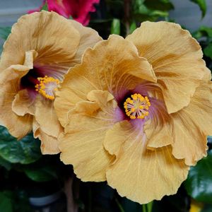 ハイビスカス🍀HONUホヌ ゴールドの 粉をかけたみたい 花が 重くて 下向いちゃう 陽の光の加減で表情も変わるね(#^.^#)