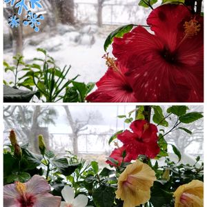 今季 2回目の積雪 窓の外は 真っ白 伊江島ハイビスカス園から届いたハイビスカスが 窓辺で咲いてます きっと あなた達 雪初めてだよね(^_^;)初めて緑のまとめ作りました 珍しいハイビスカスがもりもりです😀 時間があったら見てね(#^.^#)