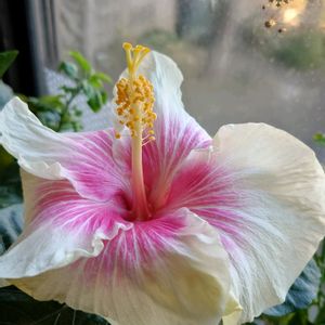 ハイビスカス🍀ボニーB 柔らかな 冬の朝日の中で ハイビスカスが 段々と開き始めたよ🥰 なんて可愛い色合いなの🤩とっても大きい(#^.^#)