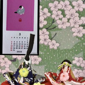 シリーズ 古布の花 3月 弥生 早くも3月、年度末。 卒業式、旅立ち、人生の節目でもある3月です。 今月の古布は緑色の葉模様に梅をあしらった絹の着物の端切れです。 お雛様は古布の手作り。 「資料館deひなめぐり」からあまりの可愛さに連れ帰りました。 胸元の梅が可愛いです。12×12cm 古布 絹 暦 越前和紙 絵は雀(スズメ) 満月 14日 新月 29日 弥生もよろしくお願いいたします。