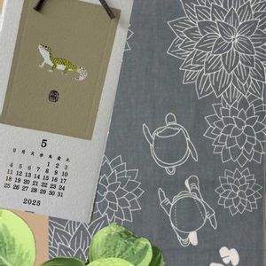 シリーズ 古布花 5月 皐月 緑溢れる爽やかな季節となりま した。 五月晴れ、花冷え、花曇り、 五月雨、早苗、春眠、陽炎、 今月の布は、お花をこよなく愛する友人から頂いた日本手拭い。 「ホスタのはたけ」 「こどもの日」に因んで。 布 木綿 手㮈染 暦 越前和紙 ヒョウモントカゲモドキ (ヤモリの一種) 満月 13日 新月 27日 花 ホスタ(ギボウシ) 小さな庭 今月もよろしくお願いいたします。