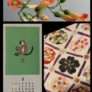 シリーズ 古布の花🌸 3月 大正時代のモスリンです。 小さな端切れです。女の子の着物でし ょうか。 布の柄は取り取りの小菊かと思います が、ドロップやおはじきにも見えます。 今年度が終わりますね。 花 カランコエ•ハッピーベル 鉢植えの花が咲きました。 可愛い雰囲気に合わせてみました。 暦 越前和紙 ミドリザル(緑猿) サバンナモンキーのこと。体色が緑色 がかっているので付いた名前とのこと。 新月 3月3日 満月 3月18日
