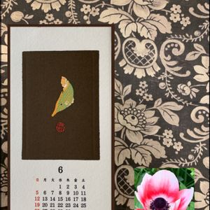 シリーズ 古布の花🌸 6月 札幌にも爽やかな季節が訪れま した。 今月の古布は大正時代のモスリ ンです。 花の連続模様は、どこか 「ウィリアム・モリス」を思わ せる素敵なデザインです。 大正ロマンを感じます。 花はアネモネでしょうか。シベ まで描かれ、花と葉がリアルで す。 古布 モスリン 暦 越前和紙 絵はテング皮剥(カワハギ) 満月 14日 新月 29日 花 右下 アネモネ 昨年、球根で植えたものです。