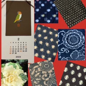 シリーズ 古布の花🌸 2月 如月 早くも2月です。今年は寒波による厳し い寒さが続きましたが、2月4日は立春 もうひと頑張りです。 藍染めによる絣織と型染め 明治〜大正、昭和のものです。 左の中は「雪んこかすり」大正時代の子 友が着ていた着物でしょうか。 絣(かすり)はあらかじめ染めた糸を織っ たもの。 紋様がかすれて見えることが特徴。 2枚は型染め、左下はかなり古いもので 色は退化して、布は柔らかくなっていま す。 型絵染めは、型紙を用いて絵画的な文様 を染めたもの。防染糊等による染め方。 線の繊細さ、デザインの美しさ、この2 枚は格別です。 布 藍染 木綿 暦 越前和紙 千年以上もの歴史あり。 手ちぎりの和紙にシルク印刷。 絵はシロハラインコ(白腹鸚哥) 満月 6日 新月 20日 花 葉牡丹 玄関フードの中から。 今月もよろしくお願いいたします。
