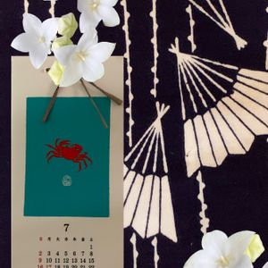 シリーズ 古布の花🌸 7月 文月 今日から7月。日本では、旧暦7月を文月 と呼び、現在では新暦7月の別名として 用いられています。 由来は七夕に詩歌を献じたり、書物を書 物を夜風にさらしたりする風習があるか らが定説となっているようです。 梅雨が明けたら本格的に夏。 今月は藍染の浴衣です。 柄に花はありませんが細い茎にプチプチ はミズヒキをデザインしたように思い ました。 庭の花、白の桔梗を添えてみました。 布 藍染木綿 昭和30年代 暦 越前和紙 千年以上もの長い歴史と伝 統に育まれた「越前和紙」 手ちぎり和紙にシルク印刷。 絵はサワガニ(沢蟹) 満月 3日 新月 18日 花 シロバナキキョウ(白花桔梗) 2022.7.20 自宅庭 文月もよろしくお願いいたします。