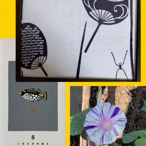 シリーズ 古布の花🌸 8月 葉月 8月に入りました。旧暦8月を葉月と呼び 現在では新暦8月の別名として用いられ ています。 葉月とは紅葉が進み葉が落ちる月。 「葉落ち月」が略されたものといわれて います。 しかし、陽暦の現代は、夏真っ最中です。 今月の古布は、古い日本手拭いの端切れ です。8月には額に入れて飾っています。 団扇の水紋模様と絞り模様。 線状に描かれているのはイネ科の植物の 葉と思われます。 アメンボもいて涼しげです。 古布 木綿 暦 越前和紙 絵はカワハギ(皮剥) 満月 2日 新月 16日 花 アサガオを合わせてみました。 2022.722澄川 葉月もよろしくお願いいたします。
