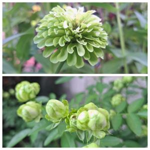 ライムグリーンのお花 気持ちがホッと落ち着くやさしい色 ↖ジニア ↙薔薇 エクレール この薔薇、剪定して落ちた枝が発根して、いま、50cmくらいになりました 強いのかな?? なので、春の花後に剪定した枝を、この薔薇の後ろに置いた鉢に挿してみました 夏を乗り越えて、葉っぱも元気 上手くいったのかな??