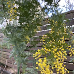 ミモザ2年生の子 昨年は小さな苗で地植えにしたら すくすく大きくなって花芽が付いて可愛らしい💛 垂れて咲いています 花後はガッツリ剪定予定です( ¨̮ )