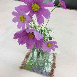 今朝 コスモスを摘んできた状態で ペットボトルの空容器に ラッピングペーパーを 巻き 💜パープルの🎀つけて✨