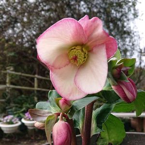 初開花のクリスマスローズ♡ こぼれ種っ子をポット上げして育苗したもの🌱 普通のお顔だけど… ソバカスは無かった☺ 裏側はピンク濃いめ🌸 コラージュは斑入りの沈丁花 つぶつぶの蕾が可愛い❤ 斑が無くなりそうかも💦