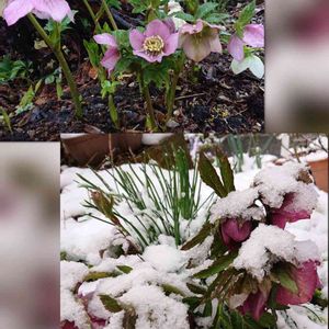 『クリスマスローズ』 今日の庭〜❄❄❄ うちで一番の古株、上は木の下の様子で雪がありません💮 うつ向く花に混じって上向きに咲いてる花を見つけました👍