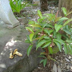 裏庭の万両 花が咲いて既に実になっているものも❤ 鳥さんの贈り物です。🐦🎁