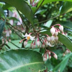 いつのまにか 万両のお花が咲いていました 赤い実をたわわにつけている時期と違う表情 葉っぱの深い緑が さりげなく