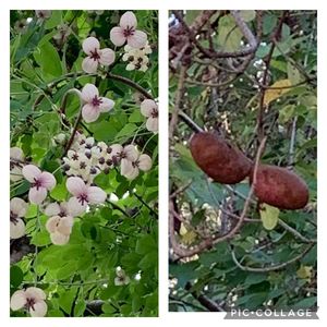 今日のお花 アケビ 今朝、アケビを収穫しました。 今、今日のお花は、アケビと気がつき、なってる写真を撮ってきました💕 今年の実は、みんな小さいです。 中身を食べるというより、果皮を調理して食べる方が好きなんですが、小さいので、果皮が薄く食べられそうにないです。 三つ葉アケビと五葉アケビとありますが、実がなってるのは、みんな三つ葉アケビのほうでした。 去年は大きくできましたが、小さいのは、今年は摘果しなかったからかもしれません🥲