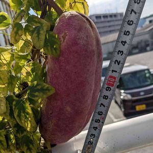 4年目で初めてアケビが実りました。 16cm強の巨大アケビ😁 割れ始めたのでもうすぐ食べ頃。 会社の駐車場の石垣からガードパイプを伝って駐輪場のフェンスに這わしています。 3年目で花が咲いたので楽しみにしてたのに実らず、4年目でようやく1個だけ実りました。
