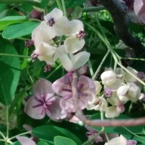 おはようございます あけびの花が咲いていました 公園のサツキの中に見つけました 綺麗で 可愛いですね!